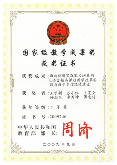 3. 2009年,王宇颖、苏小红等负责的《面向创新实践能力培养的C语言精品课程教学改革实践与教学支撑环境建设》获得国家级教学成果奖二等奖