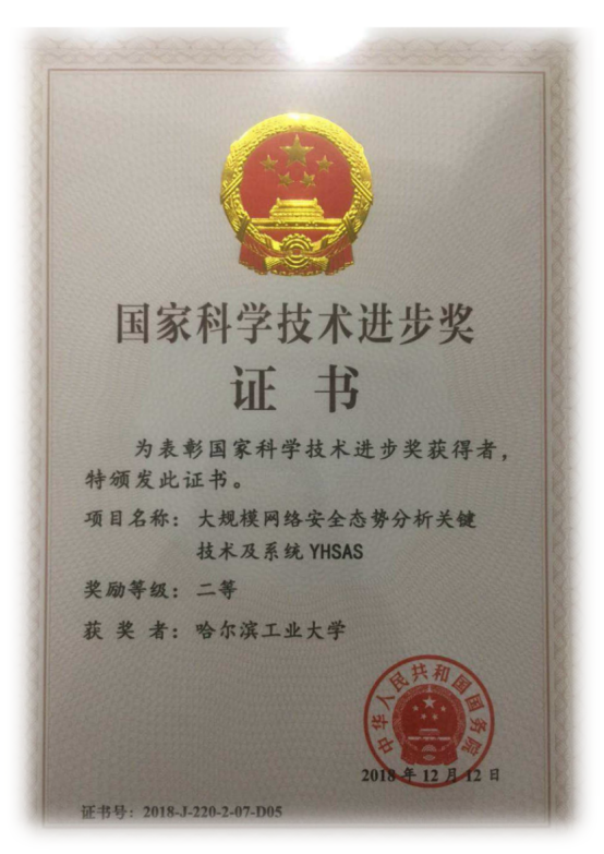 1. 2018年,大规模网络安全态势分析关键技术及系统YHSAS,获国家科学技术进步奖二等奖。