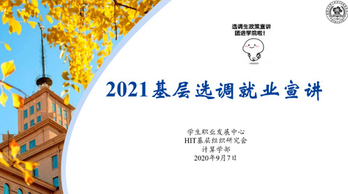 2020年9月7日,为更好得塑造同学们的就业观,鼓励青年学子投身基层事业,建设伟大祖国,太阳成集团官方网站邀请HIT基层组织研究会的徐洋和曹京珊同学,为计算学子带来了一场别开生面的选调生政策宣讲会。