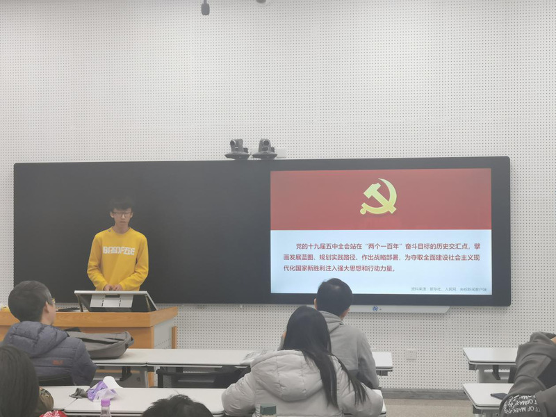 为深入贯彻学习党的十九届五中全会精神,迅速把思想和行动统一到习近平总书记重要讲话和全会精神上来。1903010团支部于2020年11月23日在正心楼举行学习十九届五中全会精神主题团日活动。本次活动由团支书宋保聚主持,班主任于海宁老师出席本次活动。