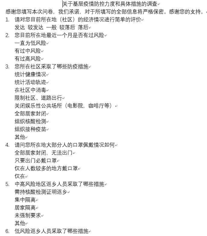 为深入学习贯彻习近平总书记贺信精神和党的十九大、十九届五中全会精神,进一步感悟抗疫精神,19级本科生于2021年1月20日至2021年3月1日进行线上社会实践,在线发布了调查问卷,深入、广泛地调查了各地疫情防控措施和居民对政策的认识和评价,并进行分析。 首先,社会实践小组成员对调查问卷进行了初步的构想与设计,着重调查关于疫情状况、疫情防控措施力度、居民认可与执行程度等方面的问题。在经过反复几次试填、修改后,小组成员积极宣传,广泛动员,在包括QQ群、QQ空间、微信和微博等公共信息发布平台发布调查问卷。最终,社会实践小组收到了来自全国各地的大量答卷。小组成员对收集到的问卷进行了分析,大家看到国内疫情形势比较乐观,疫情防控实现常态化,居民对疫情防控政策认可度较高。