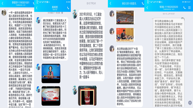 为全面贯彻落实习近平新时代中国特色社会主义思想,学习两会精神,迎接中国共产党成立100周年,1903010团支部在线上开展“学习两会精神,奉献青春力量”主题团日活动。 活动中,团支部成员观看两会视频,并提交学习照片和心得体会。通过观看视频每名同学都有自己不同的心得体会,但都对党和政府始终把人民放在首位有深刻地体会,都对“十四五”规划的完成和2035年远景目标的实现充满信心。同学们纷纷表示,作为新时代的有志青年,我们要充分发挥生力军和突击队作用,努力学习专业知识,坚定追随党的领导,无惧风雨共同前行。