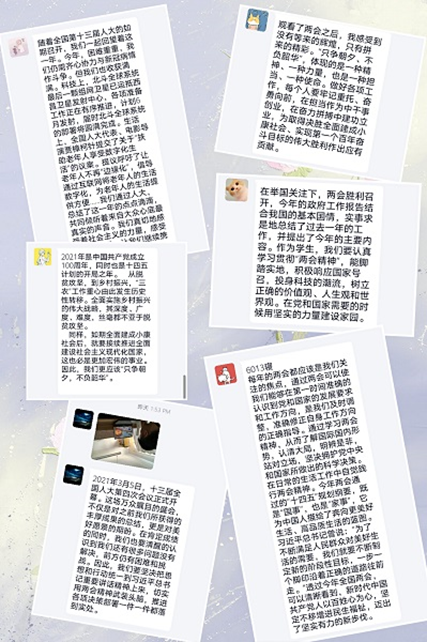 首先,1903007团支部成员通过线上观看线上视频的形式,深入学习了解两会,并通过书写观后感将自己的收获与感悟进行记录。其中有同学写到:“两会活动激发着我们的爱国热情,通过学习两会精神,我们能够了解国际国内形势,认清大局,明辨是非,站对立场, 坚决拥护党中央和国家所做出的科学决策。”除此之外通过对政府工作报告和有关精神的学习,同学对国家取得的进步和当前面临的形势也有了新的认识。支部成员在感慨中国所取得成绩的同时也深刻的感受到“没有等来的辉煌,只有拼来的精彩”。