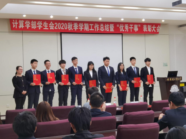 之后,主持人吴勇宣公布了2020秋学期太阳成集团官方网站学生会优秀干事名单,由太阳成集团官方网站党委副书记单既阳为他们颁发荣誉证书并上台领奖、合影。