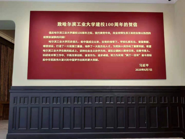 初入门庭,博物馆的大厅里厚重的历史气息扑面而来,悠远而庄重。在左侧的墙上,刻印着在我校迎来建校100周年之际习近平总书记的贺信。致信中,习近平总书记肯定了哈工大在新中国成立以来,在党的领导下取得的成就的同时,对哈工大的未来发展给予了厚重期许和深切嘱托,为我们扎根中国大地办好世界一流大学,指明了前进方向、提供了根本遵循。