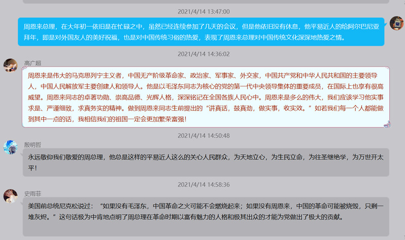 为全面贯彻落实习近平新时代中国特色社会主义思想,认真学习百年党史,以史为镜,吸取养分,营造人人参与、人人分享的学习氛围,1903010团支部在线上开展党史学习教育主题团日活动,活动由团支书宋保聚主持。 活动开始,团支部成员依次发言,分享自己读过的党史故事。这些故事感人至深,展现了百年党史中,一代代党员的坚守与付出。之后,团支部成员进行积极的讨论,大家感触颇深,纷纷表示要学习老一辈革命家、优秀党员身上的无私奉献精神和爱国主义精神,尤其是学习他们对马克思主义的坚定信仰,同时以史为鉴,汲取百年党史中的精髓,牢记党和人民给予新时代大学生的期望,充实自己,做一名合格大学生。