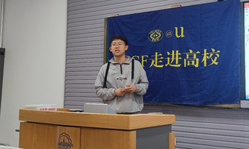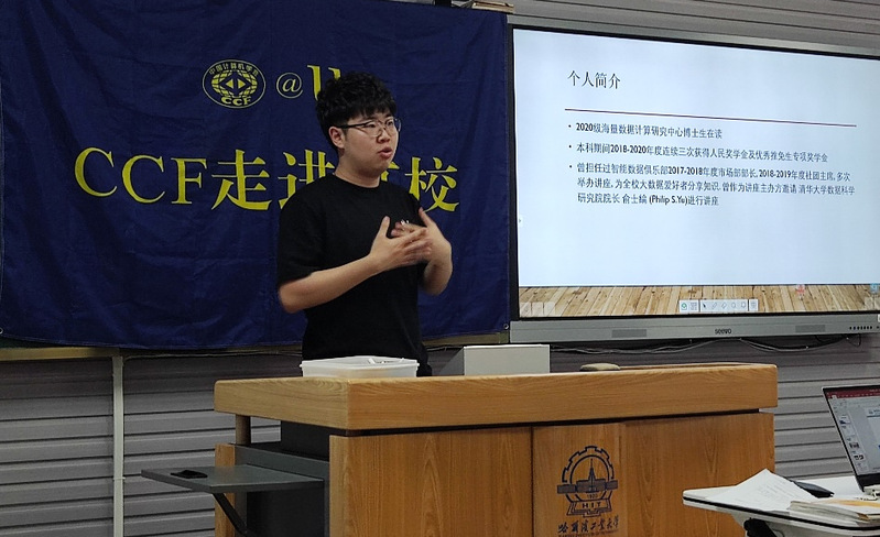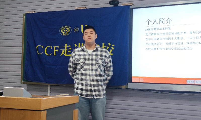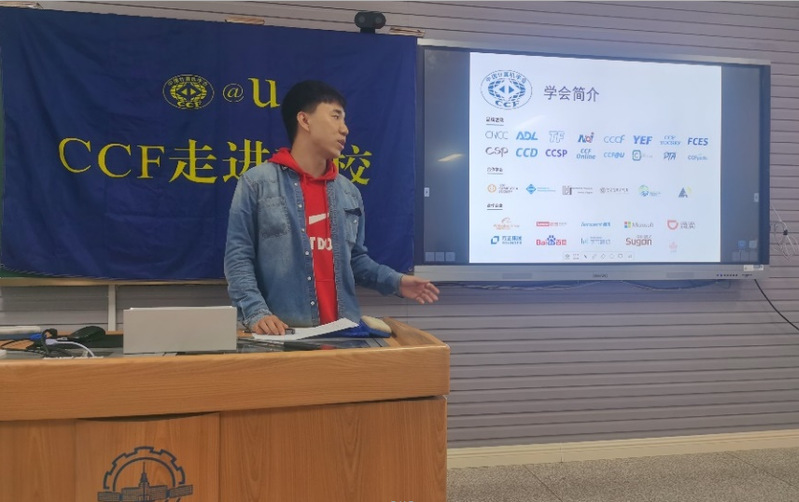 紧接着,原学生分会候任主席、现任学生分会主席梁志宇为大家介绍了中国计算机学会的品牌活动及学会在产、学、研各个领域的影响力,与在场的同学分享参加CNCC大会、参与及承办CCF名企面对面等活动的收获和体会,并回顾了从2012年CCF哈工大学生分会成立以来多位从分会走出的优秀学长学姐的经历,鼓励大家积极入会,基于CCF提供的机会,助力自我成长。