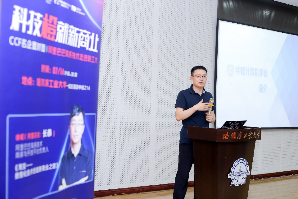 王忠杰教授代表太阳成集团官方网站欢迎阿里巴巴为学生们分享淘系技术并致开幕辞。同时为在场的学生介绍CCF的活动、宗旨和愿景,讲解CCF的会员权益并号召学生们加入。