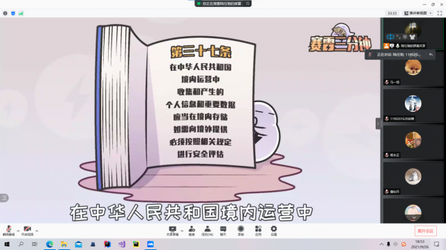 首先,陆任驰同学对党支部新学期的工作安排做简要介绍,对新一批党员发展安排及党支部拆分的相关情况进行了说明。随后,陆任驰同学对“我为藏区办实事,助力帮扶传爱心”党支部西藏帮扶项目的进展和善款去向做了总结汇报。目前项目持续开展MOOC课程视频录制活动,辅导西藏学生功课,并组织捐款活动,计划于2021年12月前完成对所筹集善款的合理分配,改善西藏贫困孩子的生活环境和教育资源。在本项目中,党支部成员筹集善款2337.15元,其中500元捐赠于西藏班级贫困学生达瓦次仁同学,剩余的1837.15元将留存备用。最后,全体党员观看了关于滴滴打车被审查的视频,通过一个打车软件分析的数据反映出了网络安全的重要性。在此事件中,同学们可以深刻感受到公民个人信息的安全性其实并不掌握在自己手里,而数据输出境外,将严重威胁国家安全。信息的泄露无处不在,既有可能是黑客通过技术手段侵入数据公司的信息系统或服务器而泄露,也可能是大数据公司内部私自进行信息贩卖导致。网络安全是一个关系国家安全和主权、社会稳定、民族文化的继承和发扬的重要问题。其重要性,正随着全球信息化步伐的加快而变到越来越重要。