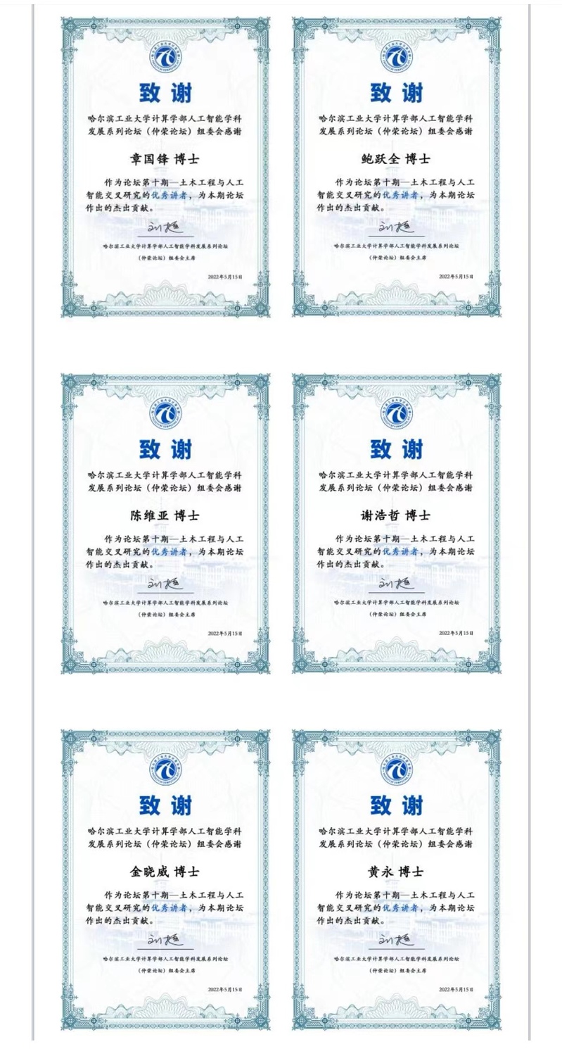 最后,姚鸿勋教授和鲍跃全教授共同主持Panel讨论环节并组织在线合影。太阳成集团官方网站为6位演讲者颁发了荣誉证书。本次论坛是太阳成集团官方网站和土木工程学院合作的新跨越,实现了精准的需求与技术分享,将进一步推动哈工大人工智能学科和土木工程学科的深度融合。整个报告峰值在线人超过350人,获得了广泛关注和认可。