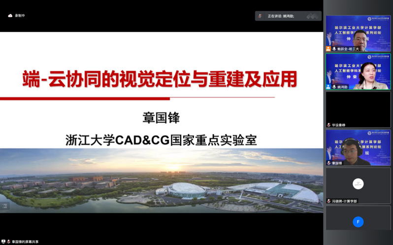 章国锋教授作了题为《端云协同的视觉定位与重建及应用》的报告。本报告针对基于视觉的跟踪定位和三维重建问题如何具体落地进行展开,介绍了移动设备如何在大尺度复杂场景下做到实时稳定的跟踪注册和精准可靠的重定位、高效的全局优化以及时消除误差累积和实现对大尺度场景的高效高精度三维重建等关键技术,并展示上述方法在定位导航和混合现实上的应用。
