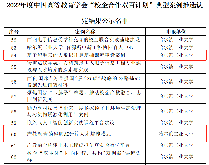 近日,我学部王宏志、苏统华两位老师申报的《基于鲲鹏云的大数据计算基础课程建设案例》、《产教融合的昇腾AI计算人才培养模式》两项案例获中国高等教育学会2022年度“校企合作 双百计划”典型推选案例。