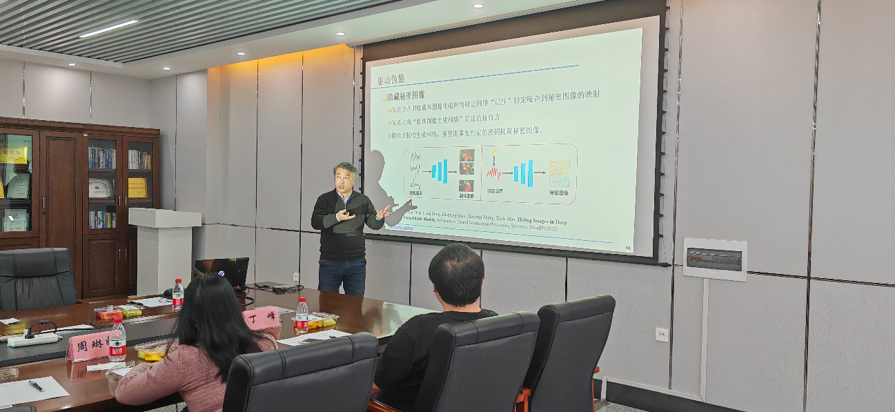 张新鹏教授作了题为《从信息隐藏到功能隐藏》的报告。数字隐写(信息隐藏)在近30年间发展迅速,张新鹏教授在该报告中探讨了深度学习兴起后信息隐藏的新发展,包括从传统的修改式隐写到图像、文本、图文互鉴的构造式/生成式隐写,也包括从数据隐藏到网络、驱动和功能的隐藏,成为支撑网络隐蔽空间的重要内容。