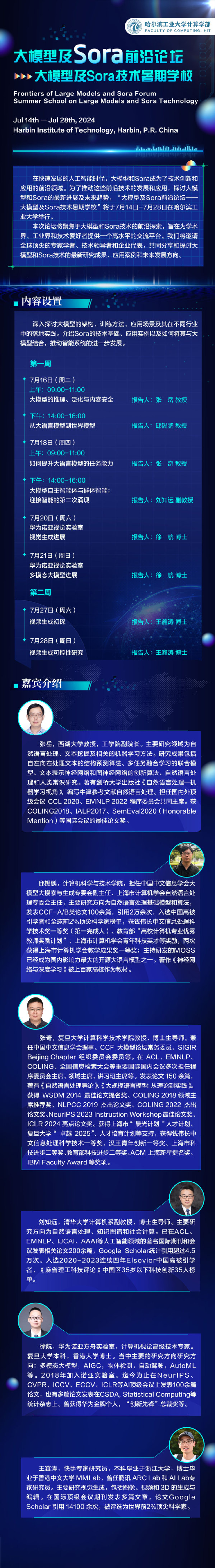 在快速发展的人工智能时代,大模型和Sora成为了技术创新和应用的前沿领域。为了推动这些前沿技术的发展和应用,探讨大模型和Sora的最新进展及未来趋势,哈工大太阳成集团官方网站将举办大模型及Sora前沿论坛暨大模型及Sora技术暑期学校。旨在为学术界、工业界和技术爱好者提供一个高水平的交流平台。我们将邀请全球顶尖的专家学者、技术领导者和企业代表,共同分享和探讨大模型和Sora技术的最新研究成果、应用案例和未来发展方向。