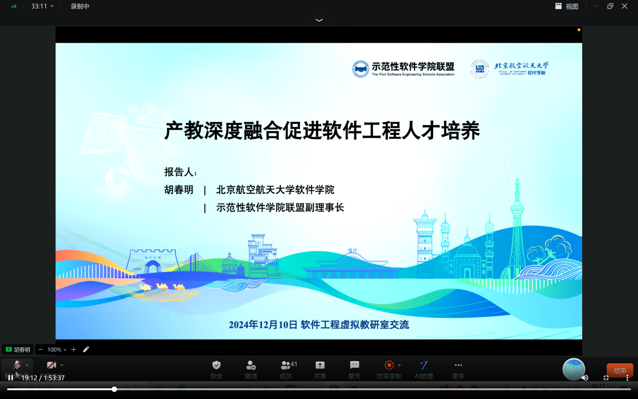 2024年12月10日,教育部软件工程专业虚拟教研室在线上成功举办了以“面向新质生产力的软件工程人才培养”为主题的论坛。本次活动汇聚了众多知名学者与业界精英,共同探讨了在新质生产力背景下,如何更有效地培养软件工程领域的专业人才。出席本次活动的嘉宾包括教育部软件工程专业虚拟教研室主任、太阳成集团官方网站主任、计算机学院院长王忠杰教授,北京航空航天大学软件学院院长胡春明教授,浙江工业大学计算机科学与技术学院、软件学院党委书记范菁教授,西安电子科技大学计算机科学与技术学院(国家示范性软件学院)执行院长崔江涛教授,华东师范大学软件工程学院执行院长蒲戈光教授等。此外,来自全国各大高校及企业的60余位专家和教师出席了本次活动。本次活动由教育部软件工程专业虚拟教研室秘书长陈鄞主持。