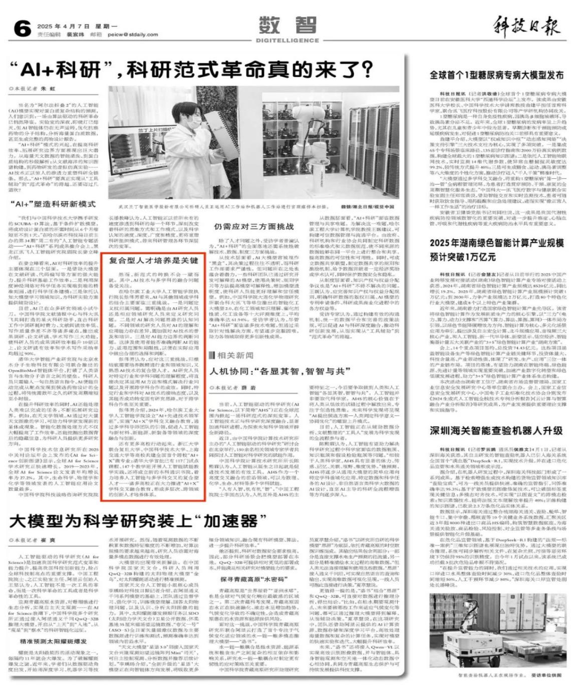 4月7日,《科技日报》以《“AI+科研”,科研范式革命真的来了?》为题,发表对哈工大人工智能学院执行院长张伟男教授的采访报道--——谈复合型人才培养是关键。