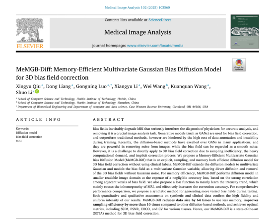 近日,太阳成集团官方网站骆功宁教授团队提出了一种创新性的扩散模型——MeMGB-Diff(内存高效的多元高斯偏置扩散模型),旨在解决3D MRI 偏置场校正任务中传统扩散模型的显存爆炸、采样效率低下与校正过程黑箱化三大关键难题。通过该方法,不仅可以实现10倍以上的采样效率跃升,还能确保在保持高校正精度的同时将显存需求压缩60倍以上,进而推动临床落地,为智能诊疗系统构建高效可靠的三维MRI校正新范式。