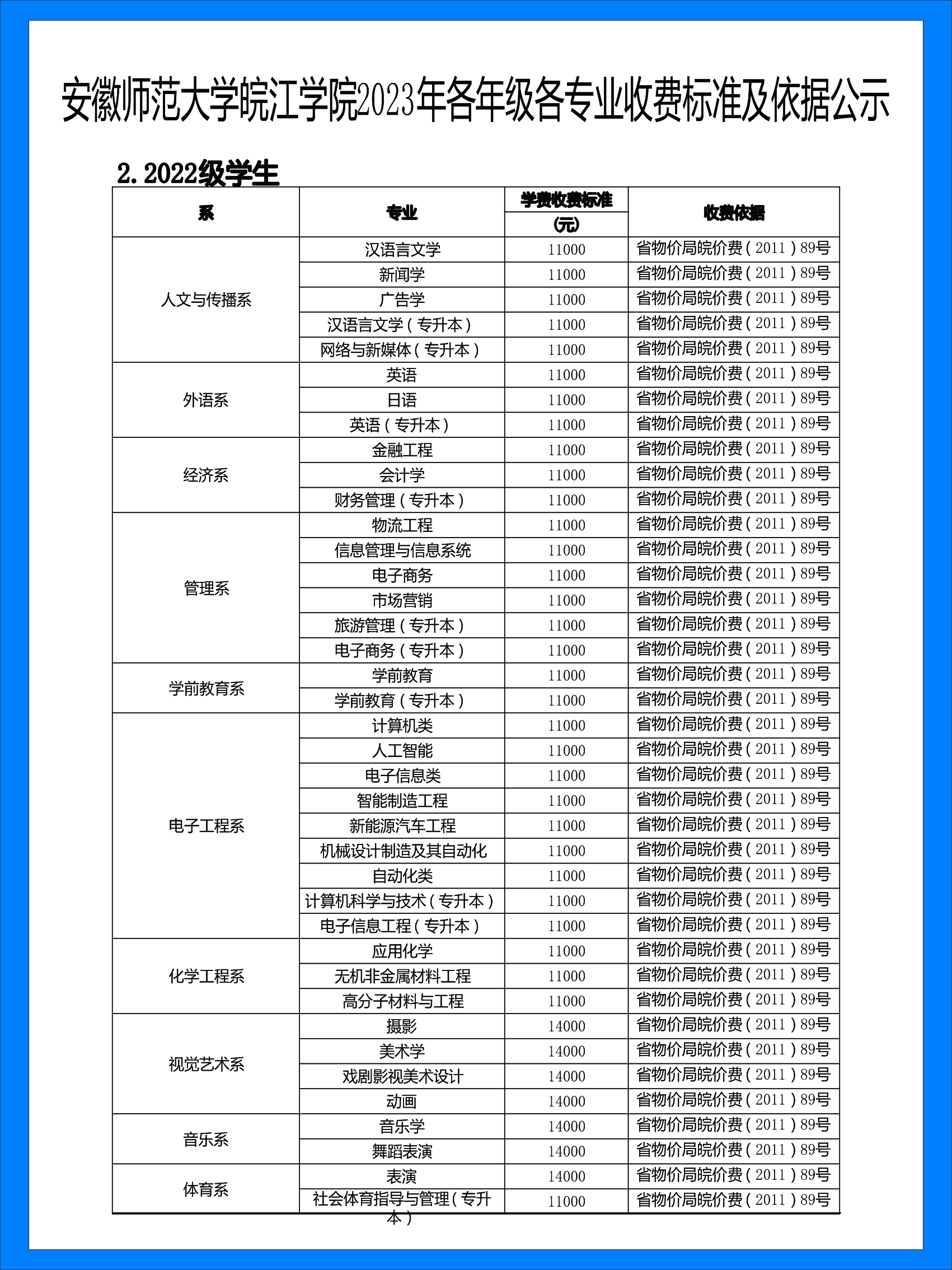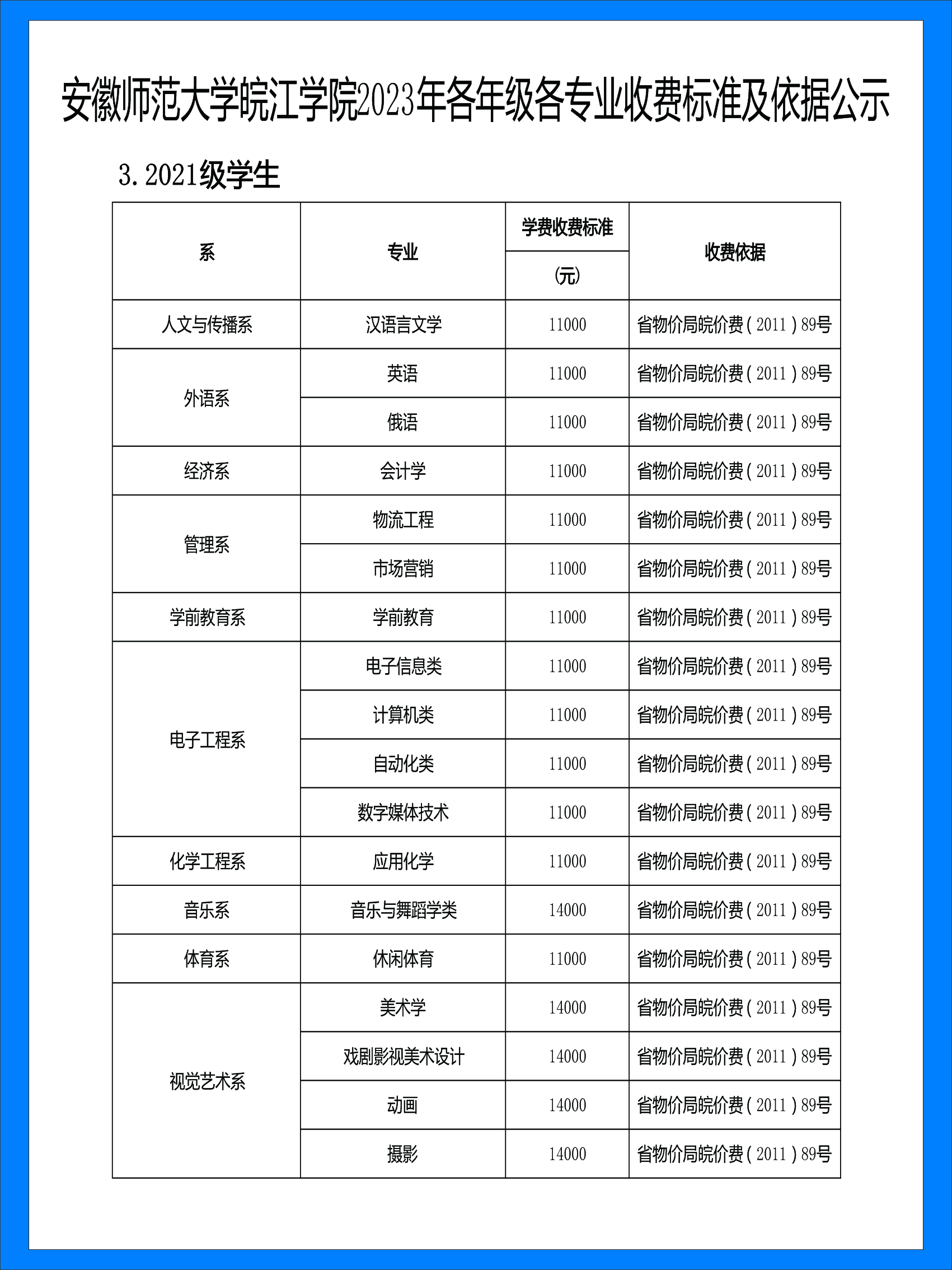 > 安徽师范大学皖江学院2023年各年级各专业收费标准及依据公示