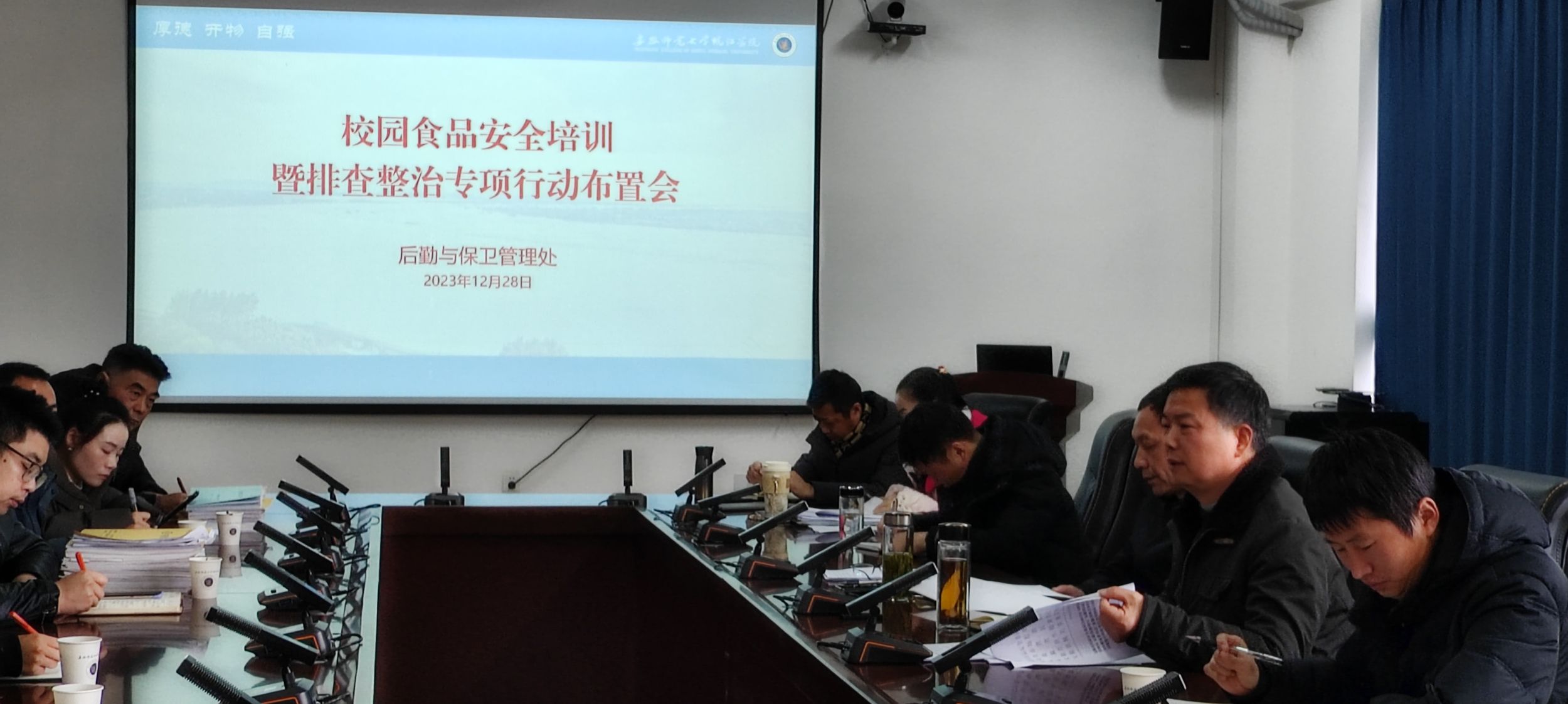 为进一步加强食品安全管理工作,根据国家、省有关部门关于开展校园食品安全排查整治专项行动的文件要求,2023年12月28日上午,学院组织召开了校园食品安全培训暨排查整治专项行动布置会,学院各食堂承包经营企业现场负责人、食品安全总监、食品安全员、仓库管理员及学院后勤与保卫管理处科长以上管理人员参加了会议,会议由学院食品安全总监黄亮副院长主持。