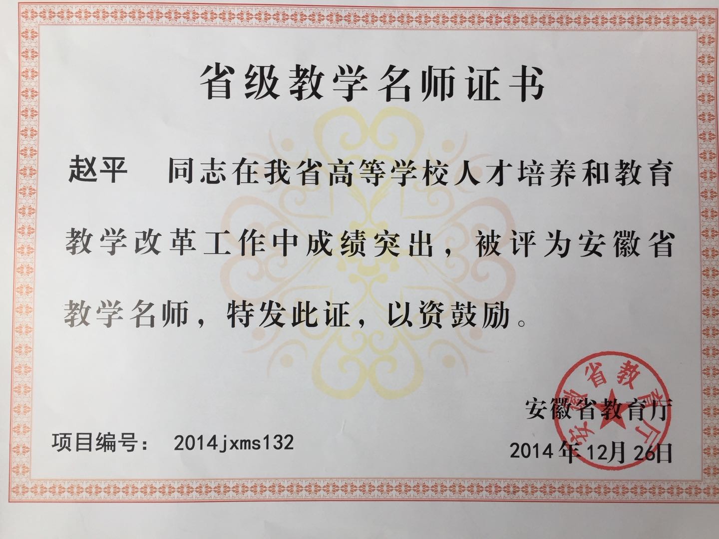 2014年12月,我部教师赵平教授荣获“安徽省教学名师”光荣称号。