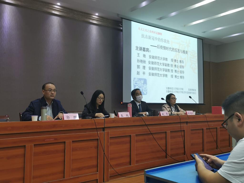 10月14日下午,由思想政治理论教研部和青年思想研究协会联合举办的人文之光论坛之系列讲座第二十八期“抗击新冠中的你我他——后疫情时代的反思和漫谈”于皖江校区图书馆学术报告厅举行。安徽师范大学王艳教授、赵平教授、郭理副教授和孙艳秋副教授四位专家应邀出席。院近300余名皖江学子共同聆听讲座。