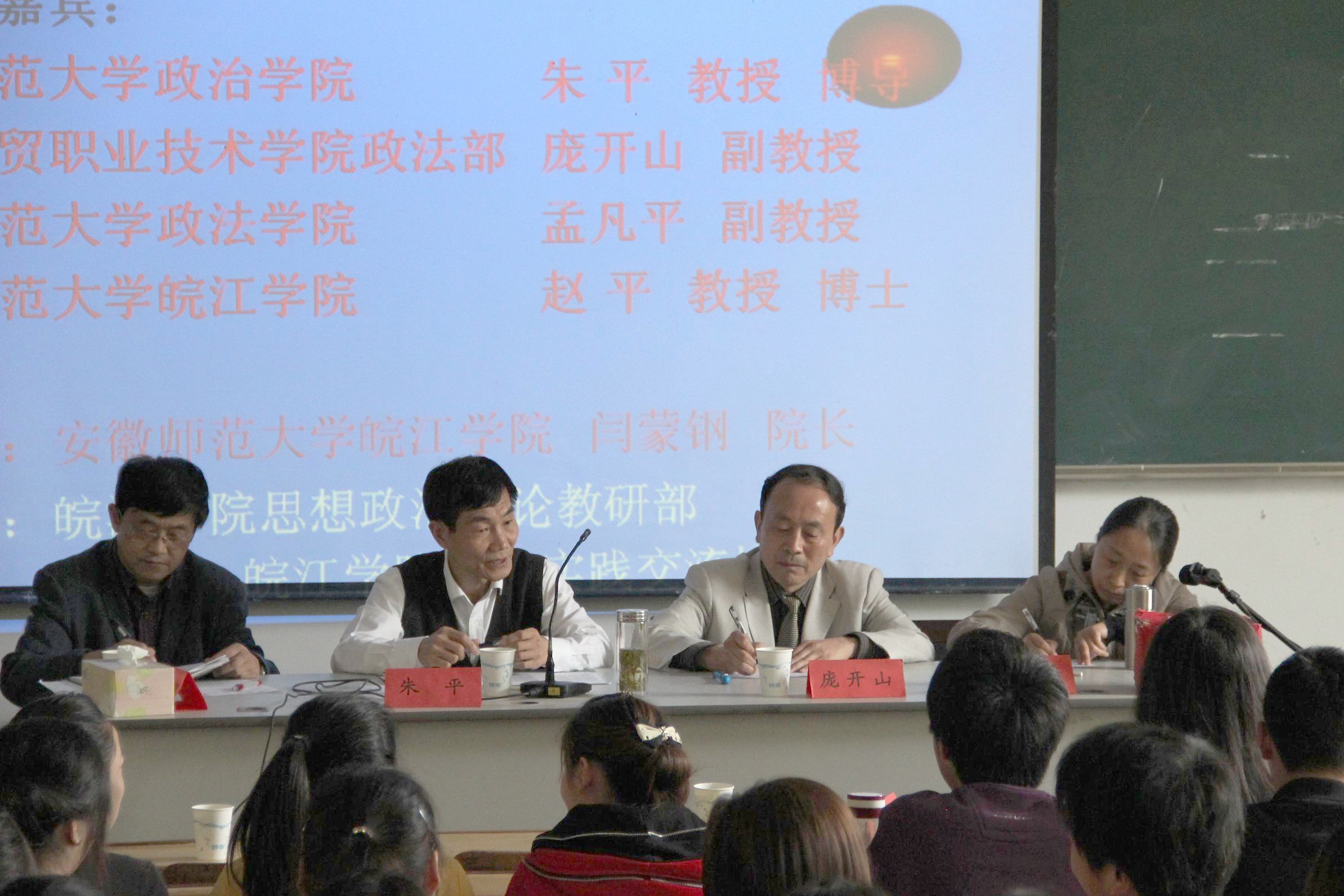 本网讯 4月25日下午,“人文之光”师生对话系列第七讲“高校到底学什么”在图书馆报告厅举行。院党委书记、院长闫蒙钢、安徽师范大学政治学院教授朱平、安徽商贸职业技术学院政法部副教授庞开山、淮北师范大学政法学院副教授孟凡平应邀主讲。院思政教研部主任赵平和部分教师参加讲座。近300名皖江学子聆听讲座。