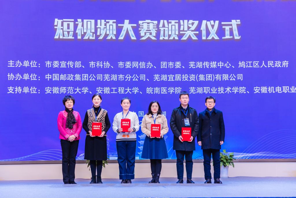 本网讯 2021年12月25日,第十届中国(芜湖)科普产品博览交易会短视频大赛颁奖仪式于芜湖市宜居国际博览中心会议中心顺利举行。我院2020级电子商务(专升本)朱晶晶、张杰的作品荣获二等奖,2019级应用化学董雪梅、2020级英语王杰荣获三等奖,学院团委获组织奖,并受邀参加颁奖仪式。
