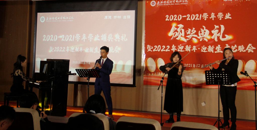 在晚会中,学院对在2020-2021学年表现优秀的学生个人、班级集体、社团组织进行表彰,王传辉、教务处处长钱奇佳、团委书记邵敏、学生处处长张铮分别为获得国家奖学金、“十佳班集体”、“十佳社团”、“皖江之星”的个人和集体颁发了荣誉证书。