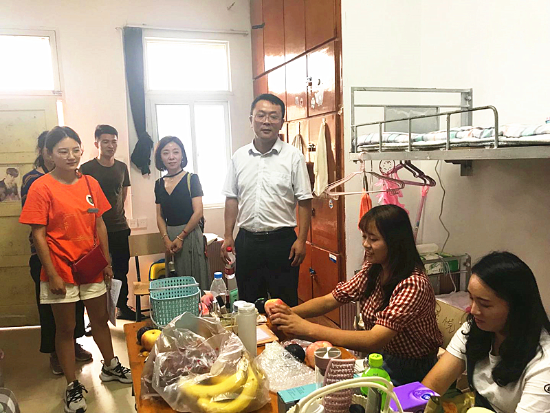 9月15日下午,学前教育系主任张更立、音体学党总支副书记李想和各位教师一起走访2019级新生寝室,为各位新同学的寝室生活排忧解难。