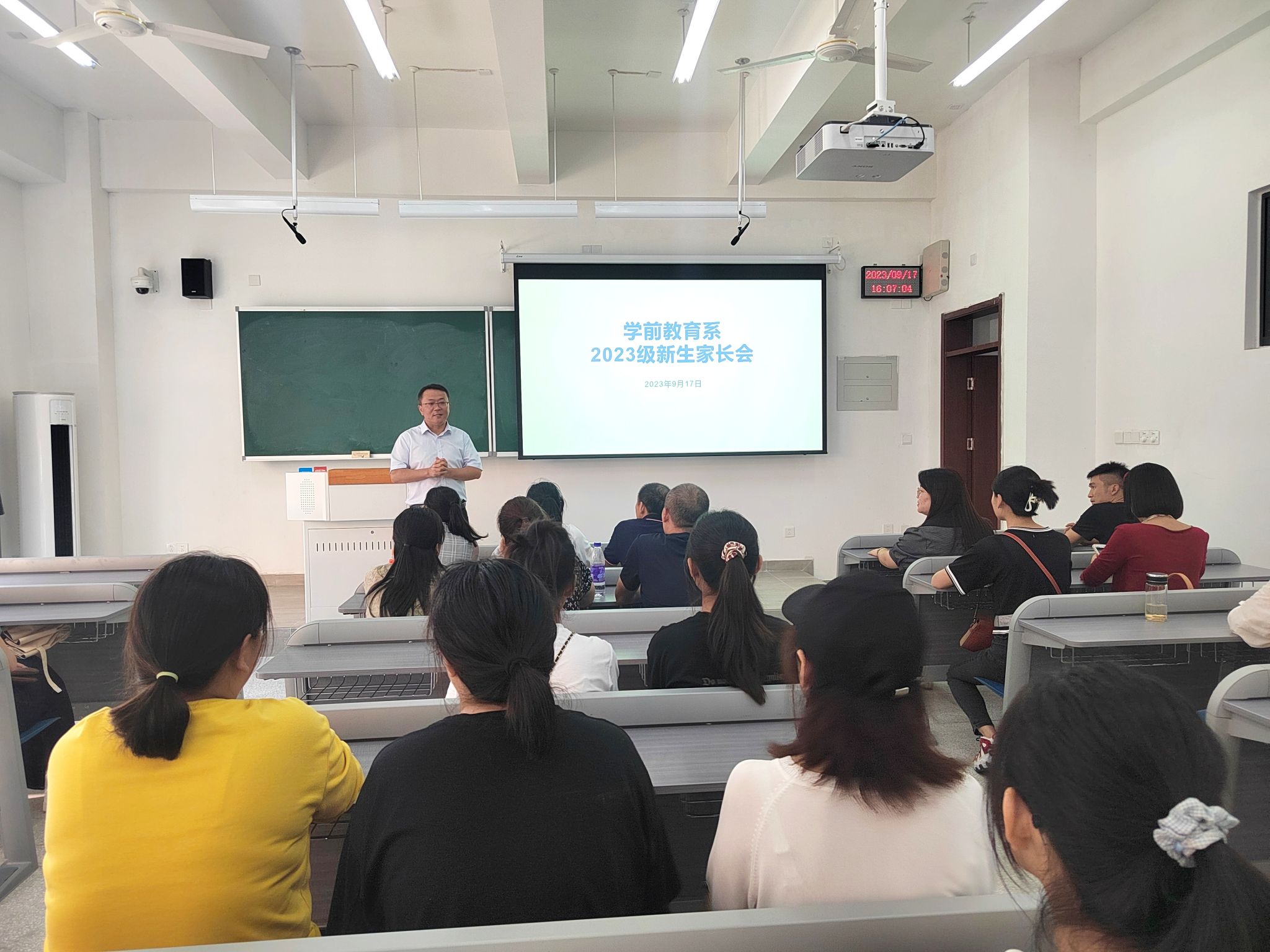 为搭建交流平台、解答新生家长疑惑,2023年9月17日下午16:00,学前教育系在第一教学楼B106教室召开新生家长会。会议面向2023级学前教育专业新生家长代表开展,学前教育系主任张更立、副书记李想、副主任刘雅莉、教学秘书刘群、新生辅导员李璐共同出席了本次会议。