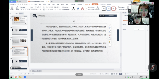 答辩采取指导教师回避制。学生首先在线演示PPT,阐述毕业创作的选题依据、设计思路、创作方法、创新点、经验总结等。利用8分钟的时间对毕业创作进行全面的陈述和展示。答辩小组老师逐一进行点评和提问,就存在的主要问题提出了修改意见或建议,学生在线并逐一回答答辩成员提出的问题。
